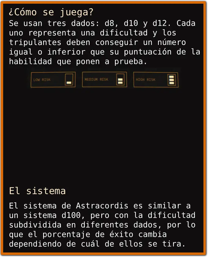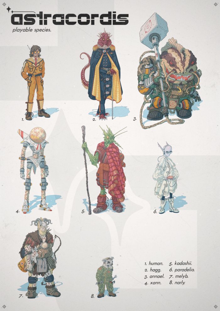 En cuanto al loop jugable, el foco de Astracordis está en la narrativa por encima de unas reglas estrictas o de combates continuos. En una partida habitual de nuestro juego, el Director de Juego conduce a los jugadores a través de una historia en la que, por lo general, buscará plantear aventuras que giren en torno a un misterio (se ha recibido una extraña señal que proviene de un planeta deshabitado), un conflicto diplomático (se ha producido un atentado contra un alto cargo del imperio humano) o un problema científico que requiere solución (la actividad sísmica de un planeta está descontrolada). No obstante, Astracordis tiene herramientas para dirigir partidas centradas en el combate si es lo que se desea; además de las armas, se utilizan otras habilidades que aportan efectos activos o pasivos: un informático puede potenciar las armas de sus aliados, un oficial de comunicaciones puede conseguir información sobre sus rivales o un historiador puede aprovechar sus conocimientos interespecie para ganar ventajas sobre determinados enemigos.